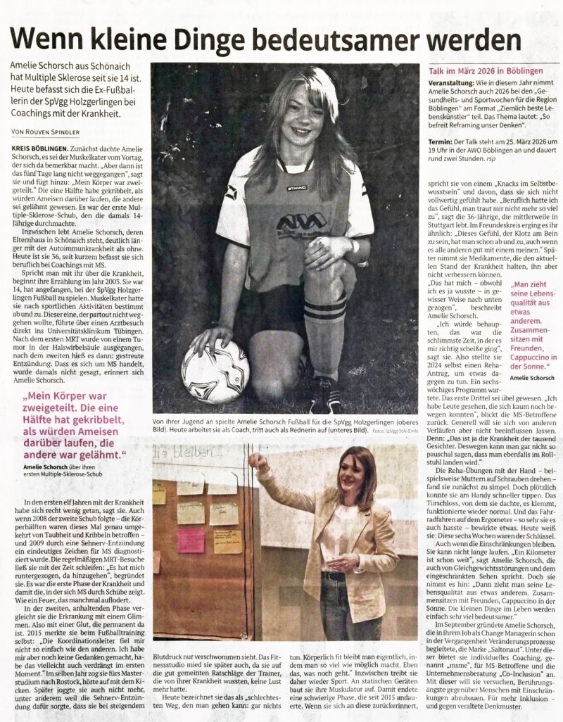Gestern ist ein Beitrag über mich in der Zeitung erschienen. Auf den ersten Blick geht es um mein Leben mit Multiple Sklerose, meinen Weg vom Fußballplatz zur Beraterin für inklusive Unternehmenskultur bzw. Coaching und darüber, wie kleine Dinge plötzlich bedeutsamer werden.